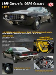 Finished in a deep Tuxedo Black paint, this 1969 Chevrolet COPO Camaro is the only COPO Camaro that was ordered with the rare code 714 yellow houndstooth interior! The model features a fully plumbed and wired COPO 427 engine, opening doors, hood, and trunk, a fully detailed interior with folding front seats, a fully detailed chassis and period correct Wide Tread tires mounted on black steel wheels with polished hubcaps and so much more!