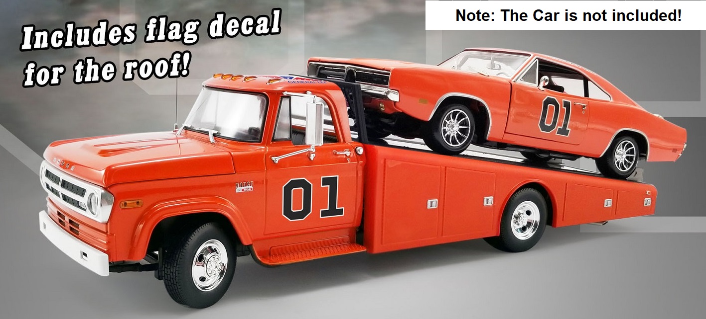 The 1970 Dodge D300 Ramp Truck – The General sports a bright orange paint job with a fully detailed interior, 01 decal on both doors and General Lee script on the roof line. Other features include the standard cab lights, poseable steering, detailed chassis, slide out ramps, adjustable wheel chocks and more!!!