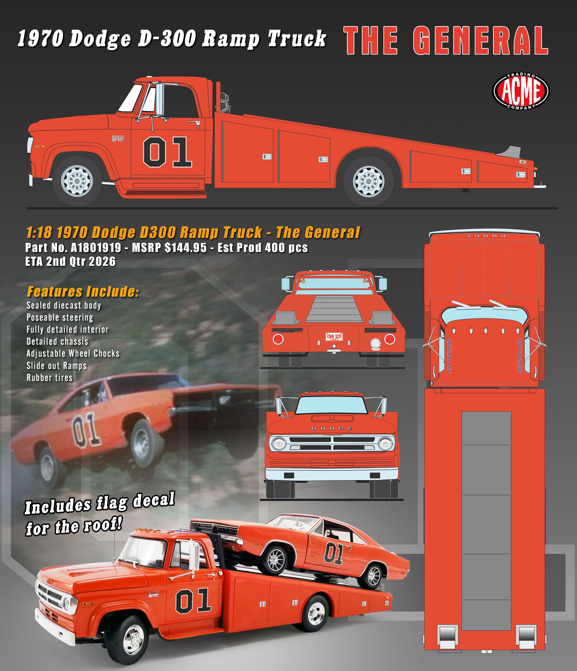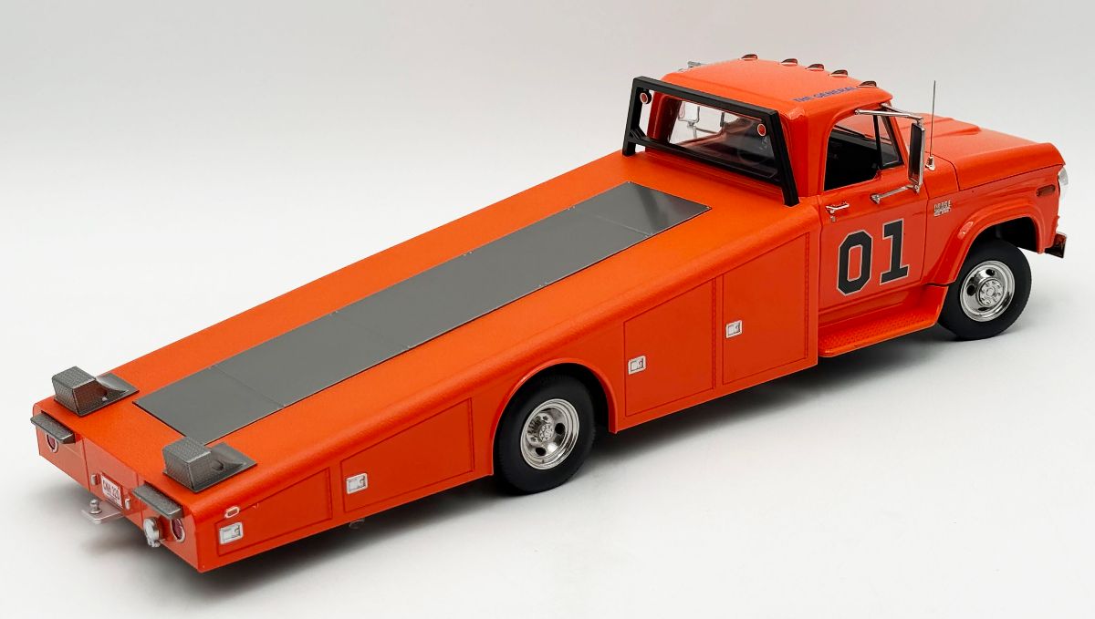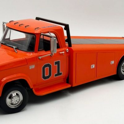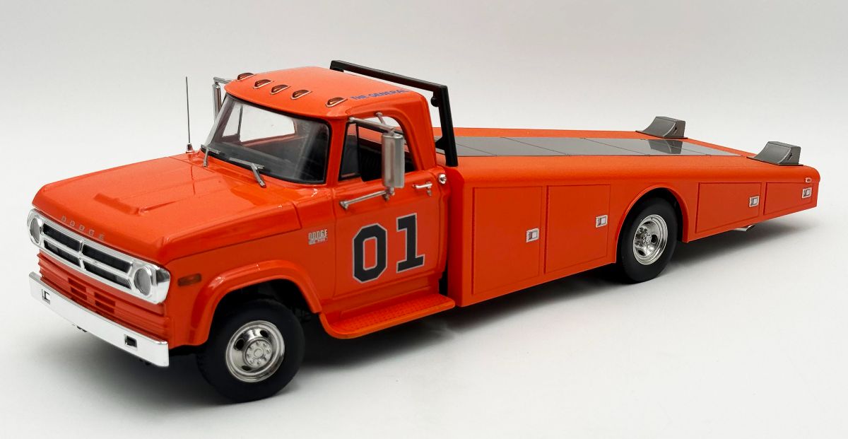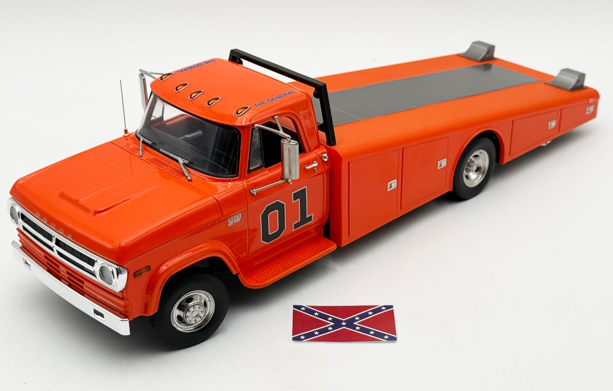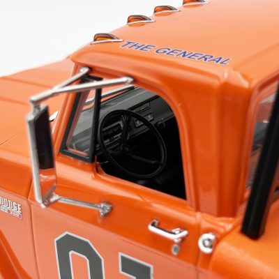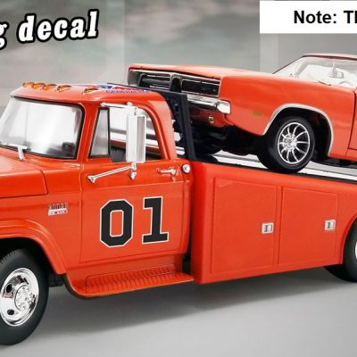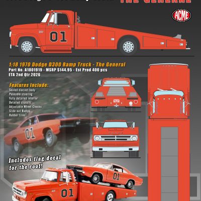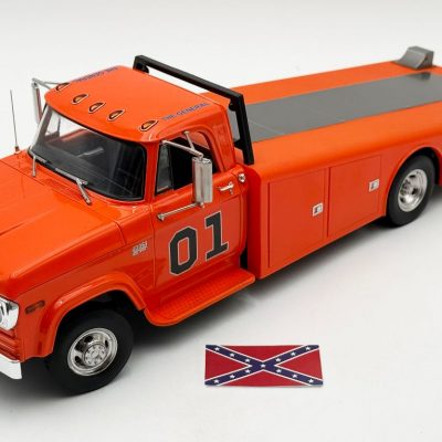 The 1970 Dodge D300 Ramp Truck – The General sports a bright orange paint job with a fully detailed interior, 01 decal on both doors and General Lee script on the roof line. Other features include the standard cab lights, poseable steering, detailed chassis, slide out ramps, adjustable wheel chocks and more!!!