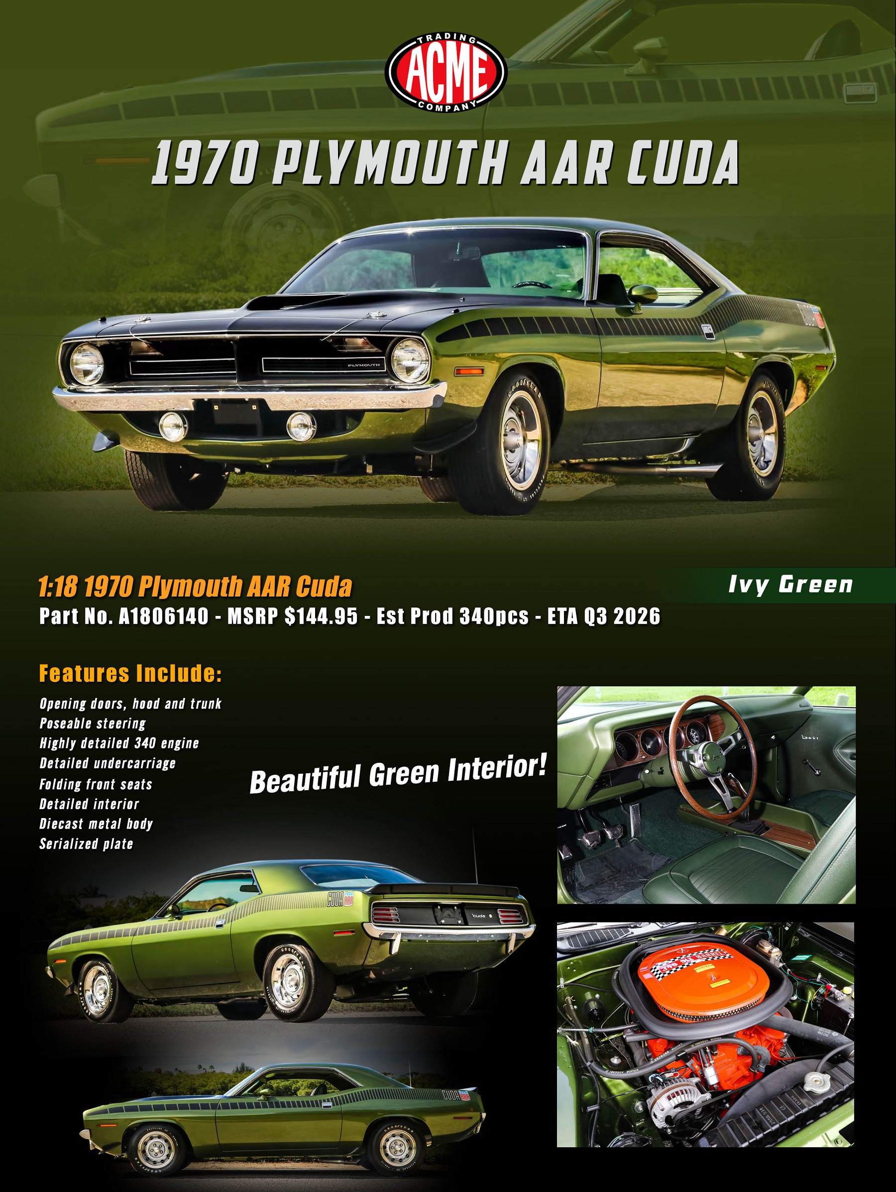 This Plymouth AAR Cuda sports a gorgeous Ivy Green paint with the strobe stripes down the side and a beautiful green interior! Under the hood a fully detailed 340 engine with dual exhaust sending power to the Rallye wheels and tires and so much more!!