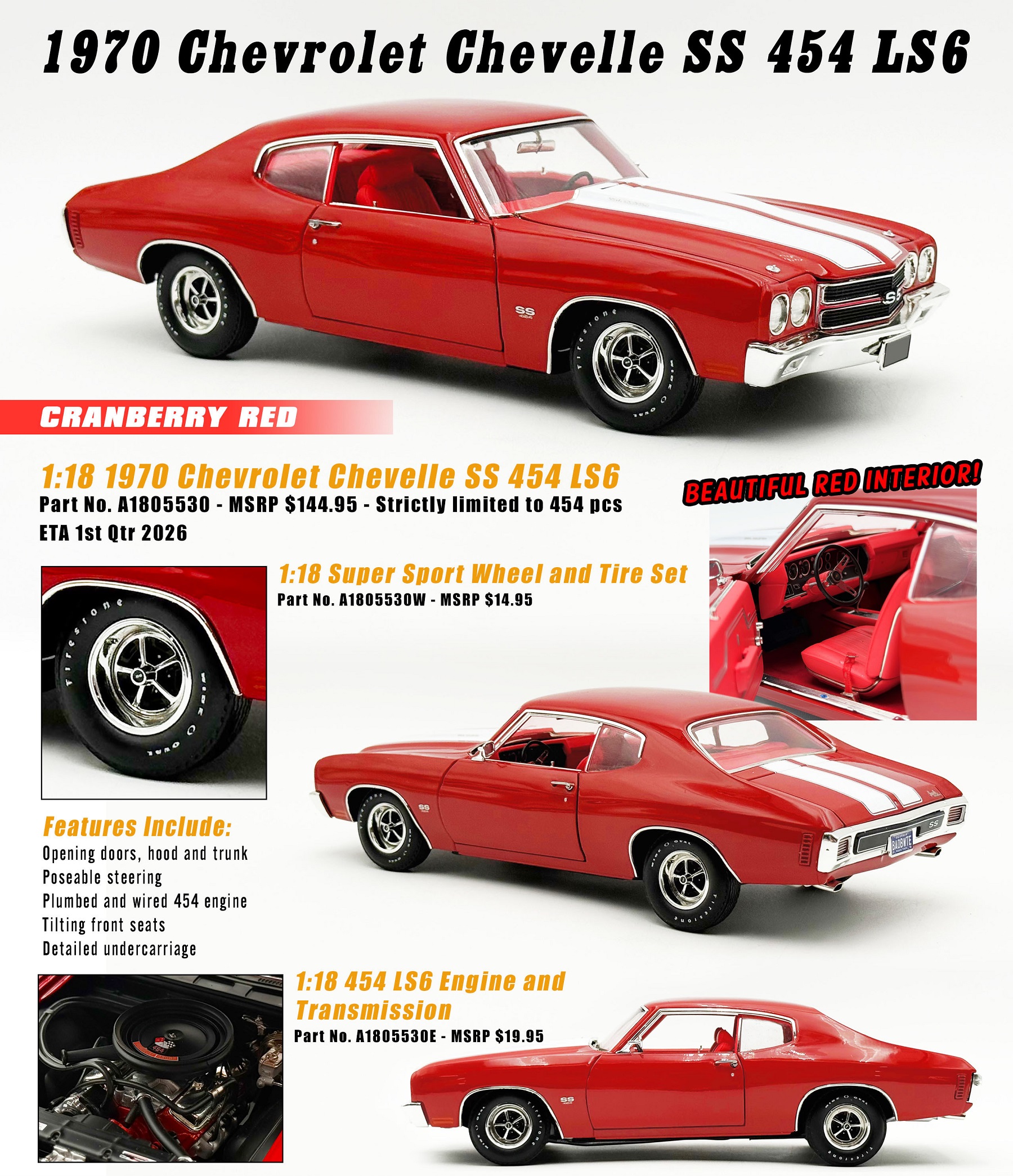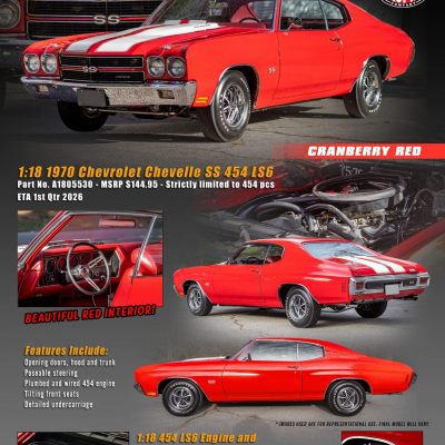 This 1970 Chevrolet Chevelle SS 454 LS6 is decked out in a stunning Cranberry Red paint with white racing stripes with a stunning red interior. Lurking under the cowl induction hood is the famed LS6 engine churning out 450 hp and 500 lb. ft or torque. The car was designed to look fast standing still! With the SS and 454 emblems that adorn the car, making certain competitors knew what they were up against.