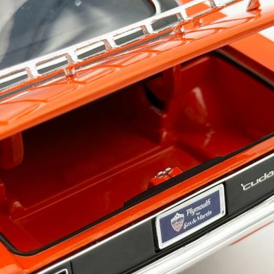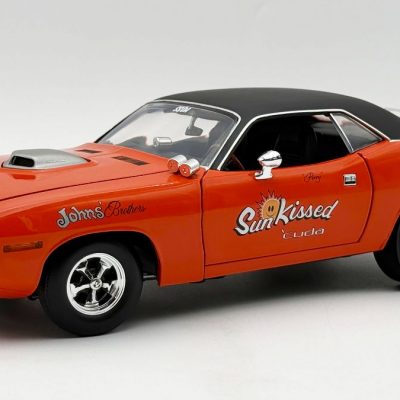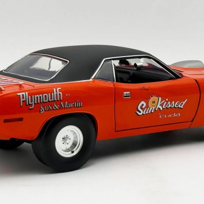 This 1970 Plymouth HEMI Cuda Sun Kissed Sox & Martin features the high impact Vitamin C paint sporting a black vinyl top certain to catch your competitor’s eye. Under the shaker hood, powered by the legendary 426 HEMI engine that provides beastly power to the Centerline/Keystone drag wheels and tires. Featuring the Plymouth Sox & Martin logos on the rear quarter panels and Sun Kissed Cuda on both doors.