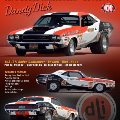 ACME has pulled out the stops on this iconic Challenger! It is powered by a 426 HEMI that provides all the power to the Centerline drag wheels and tires (which are available separately as well). The model also features a fully decorated exterior that matches the paint scheme that Dick ran back in the 70s, opening doors, hood, and trunk, tilting front seats and a fully detailed interior with a roll cage.