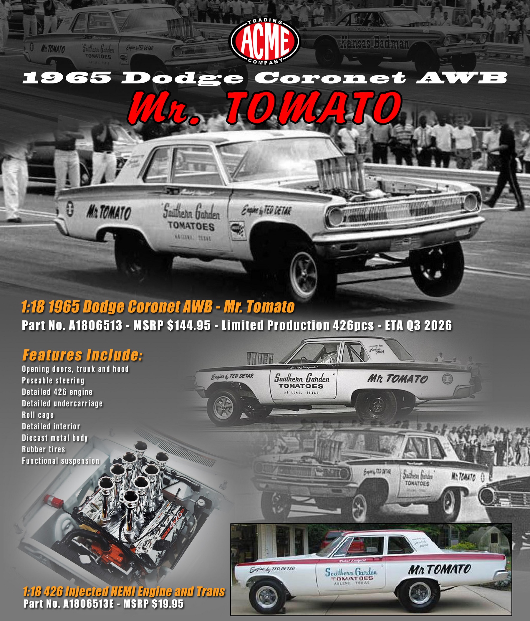 Year / Make / Model  – 1965 Dodge Coronet AWB “Mr Tomato”